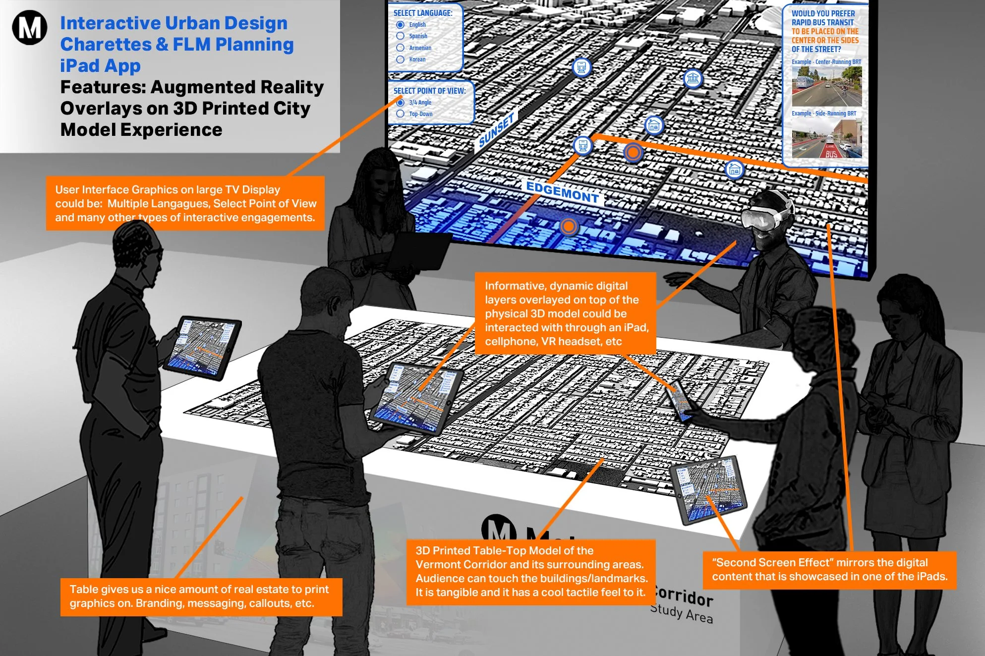 To support public planning discussions around the Vermont Transit Corridor, we teamed up with city of LA to explore an Augmented Reality (AR) experience that would allow community members to visualize proposed transit station designs directly on top of printed corridor maps.